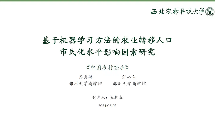 This study, published in China Rural Economy (a leading Chinese journal in Agricultural and Forestry Economic Management), employs various machine learning methods, including multiple linear regression, penalized regression, ensemble learning, and deep learning, to examine the factors influencing the urbanization level of the agricultural migrant population. The article offers new insights and methodologies for analyzing these influencing factors through machine learning techniques.