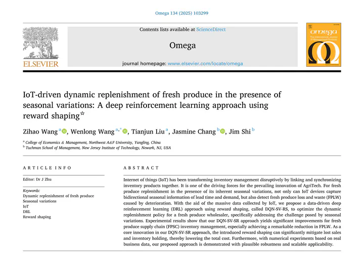 This study, published in Omega, a prominent journal in Management Science, investigates the application of Deep Reinforcement Learning (DRL) to dynamic replenishment in fresh produce supply chain. We specifically address the bidirectional seasonal variations in both supply lead time and demand of fresh produce. To enhance dynamic replenishment performance, a Reward shaping function was innovatively designed based on the “zero-inventory” paradigm.