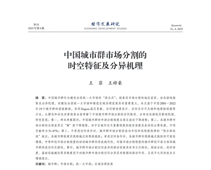该研究通过Dagum基尼系数、空间核密度估计等方法,探明了中国城市群市场分割呈波动下降趋势、区域差异主要源于超变密度、存在俱乐部收敛与空间趋同效应,并揭示了财政分权等多元因子及其交互作用对空间分异的驱动机制,为建设全国统一大市场提供了重要实证依据。