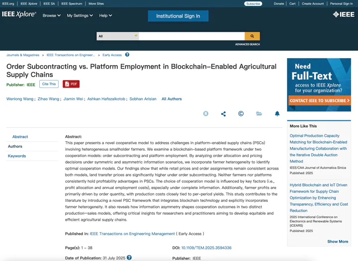 In this article, we present a novel cooperative model to address challenges in platform-enabled supply chains (PSCs) involving heterogeneous smallholder farmers. We examine a blockchain-based platform framework under two cooperation models: order subcontracting and platform employment. By analyzing order allocation and pricing decisions under symmetric and asymmetric information scenarios, we incorporate farmer heterogeneity to identify optimal cooperation models. Our findings show that while retail prices and order assignments remain consistent across both models, land transfer prices are significantly higher under order subcontracting. Neither farmers nor platforms consistently hold profitability advantages in PSCs. The choice of cooperation model is influenced by key factors (i.e., profit allocation and annual employment costs), especially under complete information. In addition, farmer profits are primarily driven by order quantity, with production costs closely tied to per-period yields. This study contributes to the literature by introducing a novel PSC framework that integrates blockchain technology and explicitly incorporates farmer heterogeneity. It also reveals how information asymmetry shapes cooperation outcomes in two distinct production–sales models, offering critical insights for researchers and practitioners aiming to develop equitable and efficient agricultural supply chains.